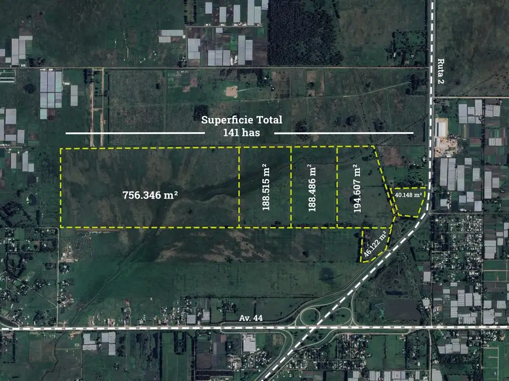 141 Hectáreas, sobre 44 y ruta 2, ideal para desarrollar proyectos en la zona, debido a su alto transito y conexión con otras rutas.