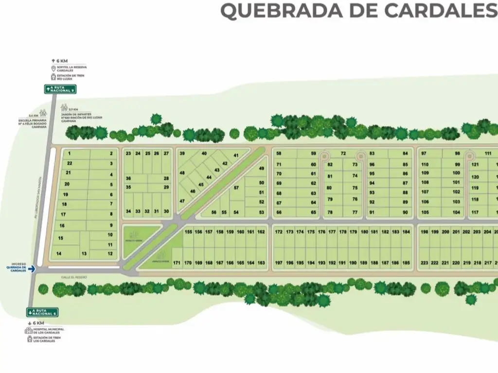 * El barrio cuenta con una excelente ubicación, a 6km de Ruta 6 y Ruta 9, lo cual brinda un rápido y fácil acceso a distintos medios de transporte público. Próximas al barrio podrás encontrar parques y mucho espacio verde.