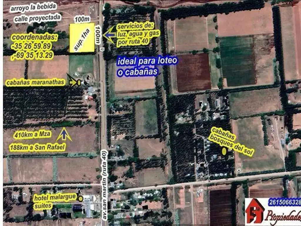 5ta.Propiedades: vende por cuenta y orden de tercero, excelente terreno en esquina, bien ubicado, a 1900m centro de Malargue, a 500m de hotel Malargue suites, el terreno posee una superficie de 10.000m2, con un frente a la ruta 40(Avenida San Martin) en 100m y un fondo de 100m, entorno de complejos de cabañas y hoteles.
