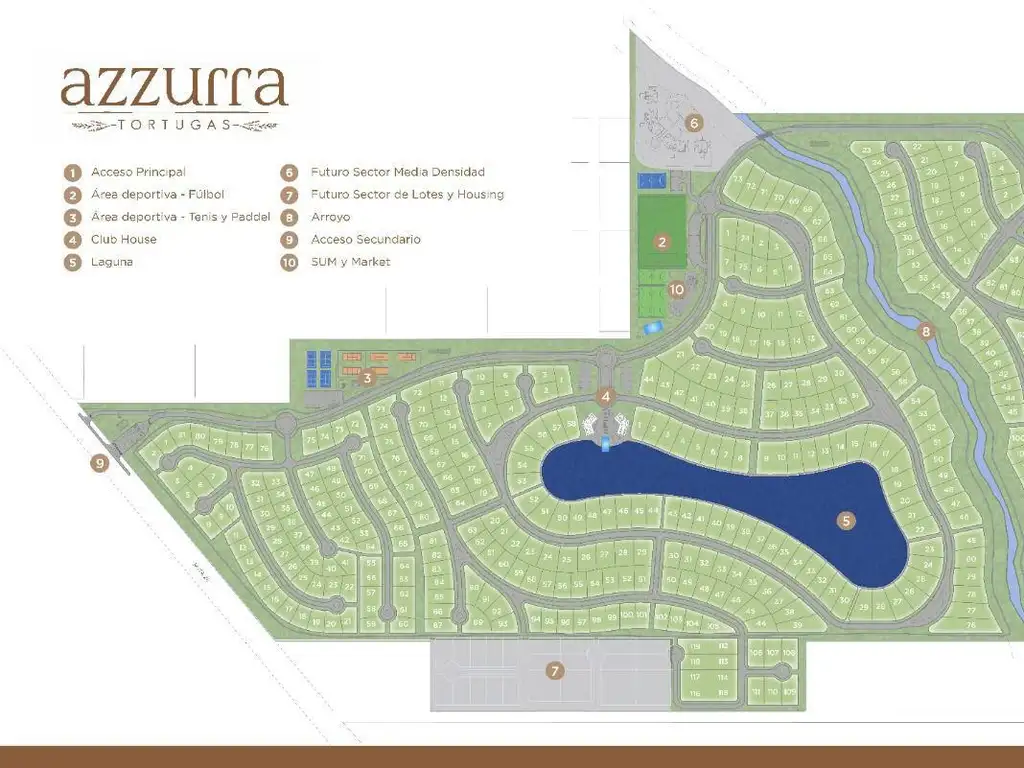El proyecto ofrece una variada propuesta de calidad con más de 400 lotes unifamiliares, un lugar para proyectos de media densidad y housing. Un acceso principal, un acceso secundario, una completa área deportiva, senderos y reservas naturales, una laguna natural de más de 4 hectáreas, club house, gimnasio, kids club, entre otros forman parte de la propuesta integral de amenities y servicios de Azzurra.