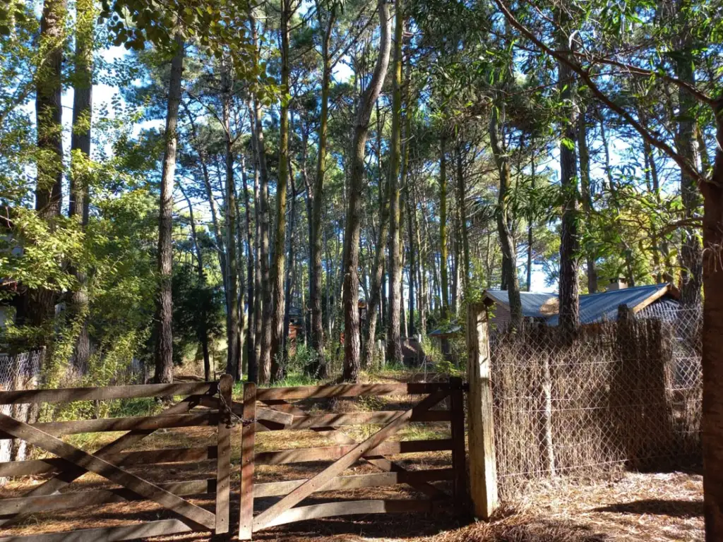Terreno cercado con tranquera en su frente y gran cantidad de pinos