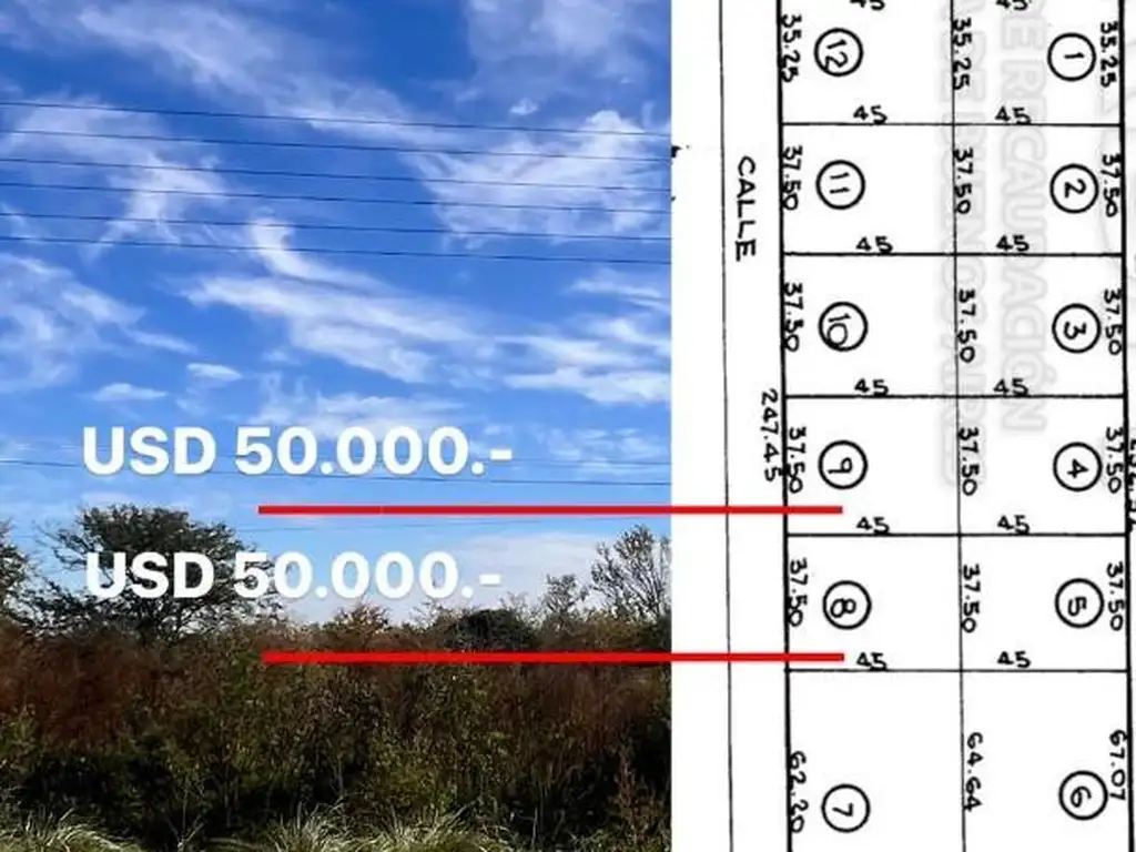 Lote n° 9: posee 37.50m. de frente x 45m. de fondo, siendo su superficie total de 1.687,50m2. Valor USD 40.000.-