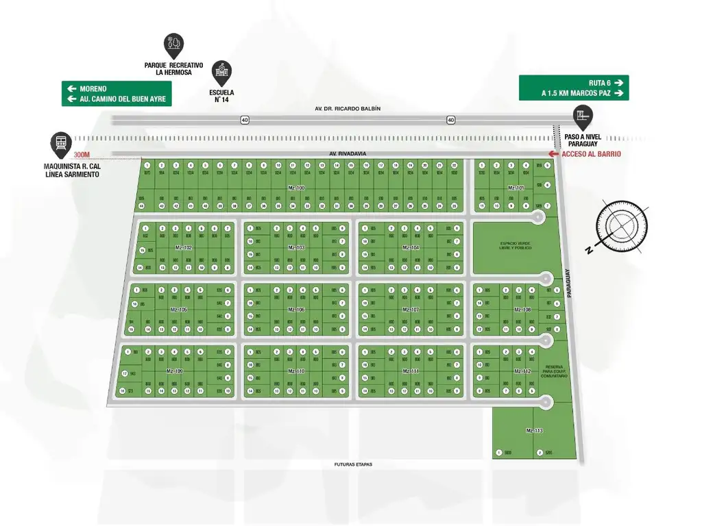 Ubicado en Marcos Paz. Barrio abierto con una única entrada. Cuenta con excelente ubicación sobre la Ruta 40, a 10 minutos de la Autopista Camino del Buen Ayre, próximo al centro comercial, con muy buen acceso a transporte público. A pocas cuadras de la Estación de Tren Belgrano Sur.