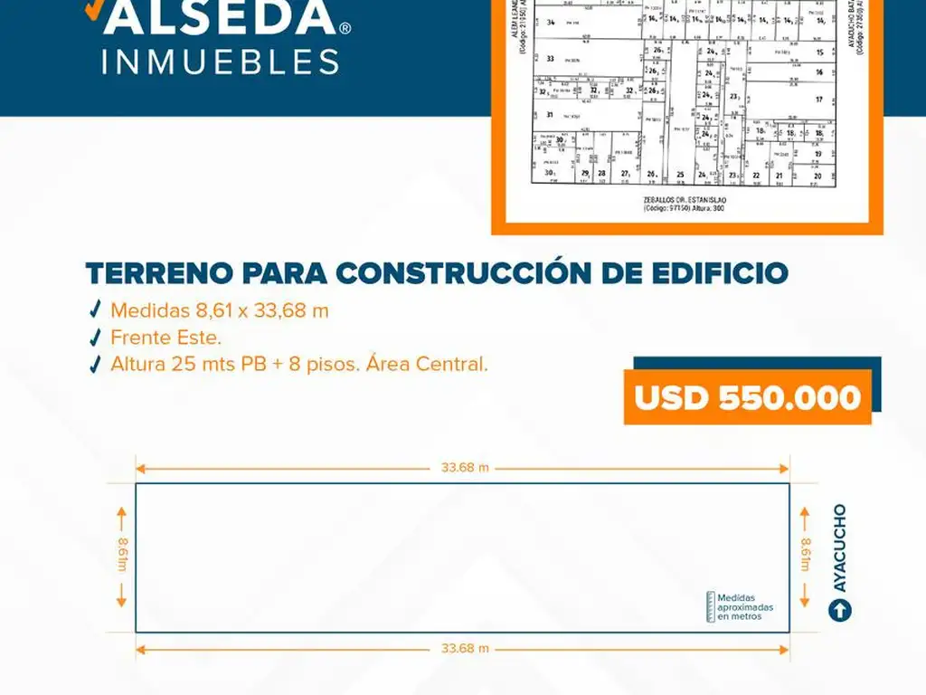 8,61 x 33,68 total 288 m2. Altura Maxima 25 mts. ( planta baja y 8 pisos - Area central)
