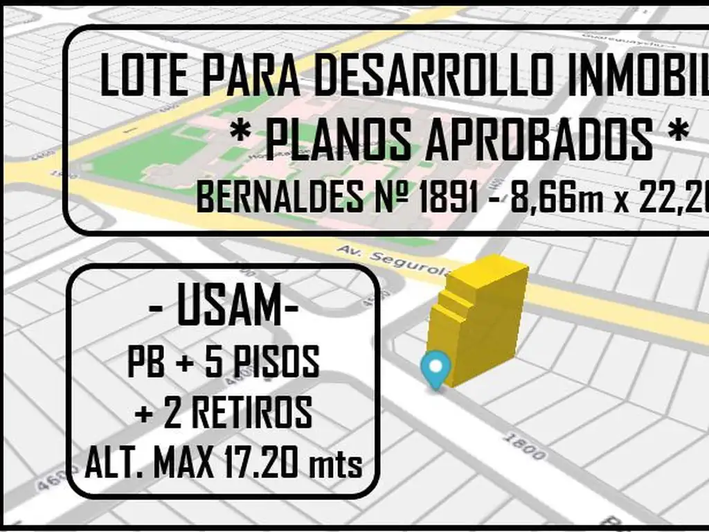 El lote cuenta con planos aprobados para la construcción de 7 pisos, Superficie total 176.70m2. Frente 8,66m Fondo 9.00m. Lateral derecho 22.20m. Lateral izquierdo 20.30m. Zonificación USAM, altura máxima 17,20 mts. Superficie construible aproximada 1017.00 mts2