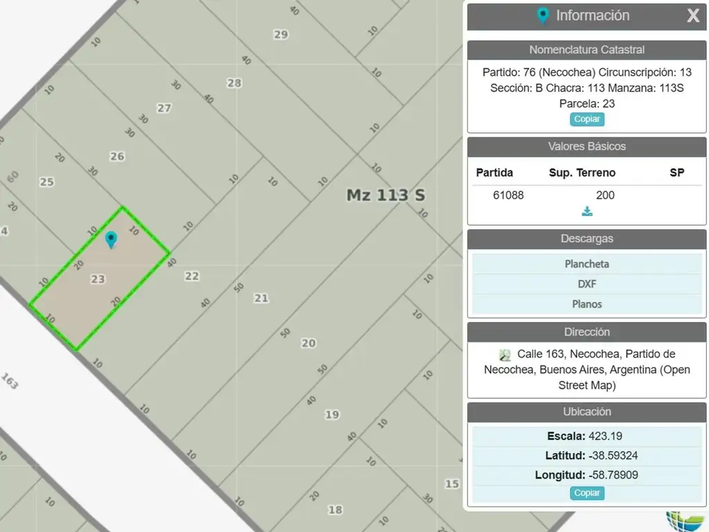 Datos Catastrales Partido: 76 (Necochea), Circunscripción: 13, Sección: B, Chacra: 113, Manzana: 113S, Parcela: 23.