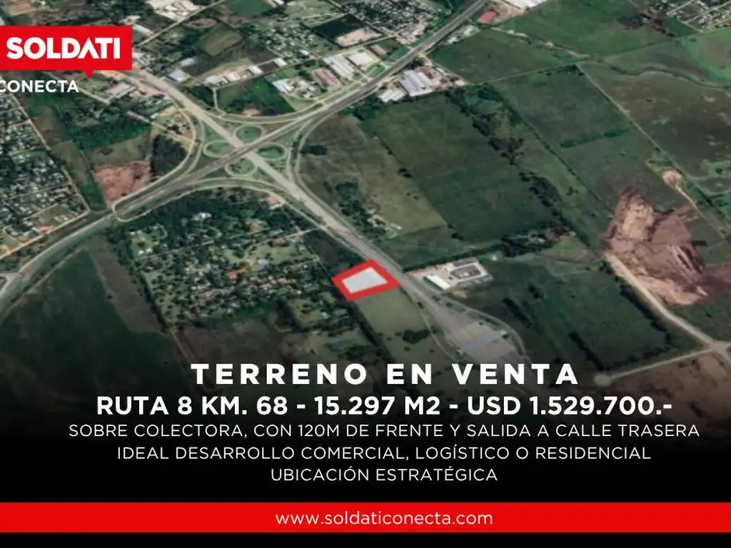 Ubicado estratégicamente sobre la colectora de Ruta 8 a la altura del Km 68, este terreno de 15.297 m2 presenta un frente de 120 metros lineales sobre la traza principal, con excelente visibilidad y acceso inmediato al Peaje Larena y al cruce con Ruta 6.