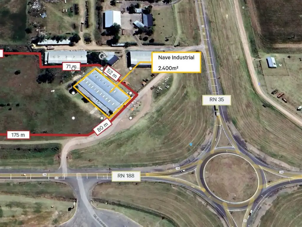 Ultimo terreno industrial disponible en la rotonda de las rutas nacionales 188 y 35. Cuenta con una nave industrial de 2.400m2. A 500mts de la estación YPF para camiones más importante de la región y frente al hotel 4 estrellas "Bel Posto".