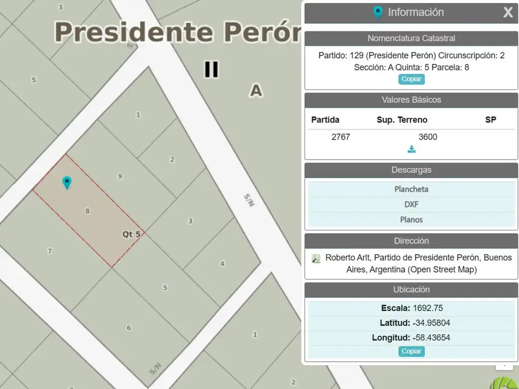Partido: 129 (Presidente Perón) Circunscripción: 2 Sección: A Quinta: 5 Parcela: 1, 2, 8 y 9.