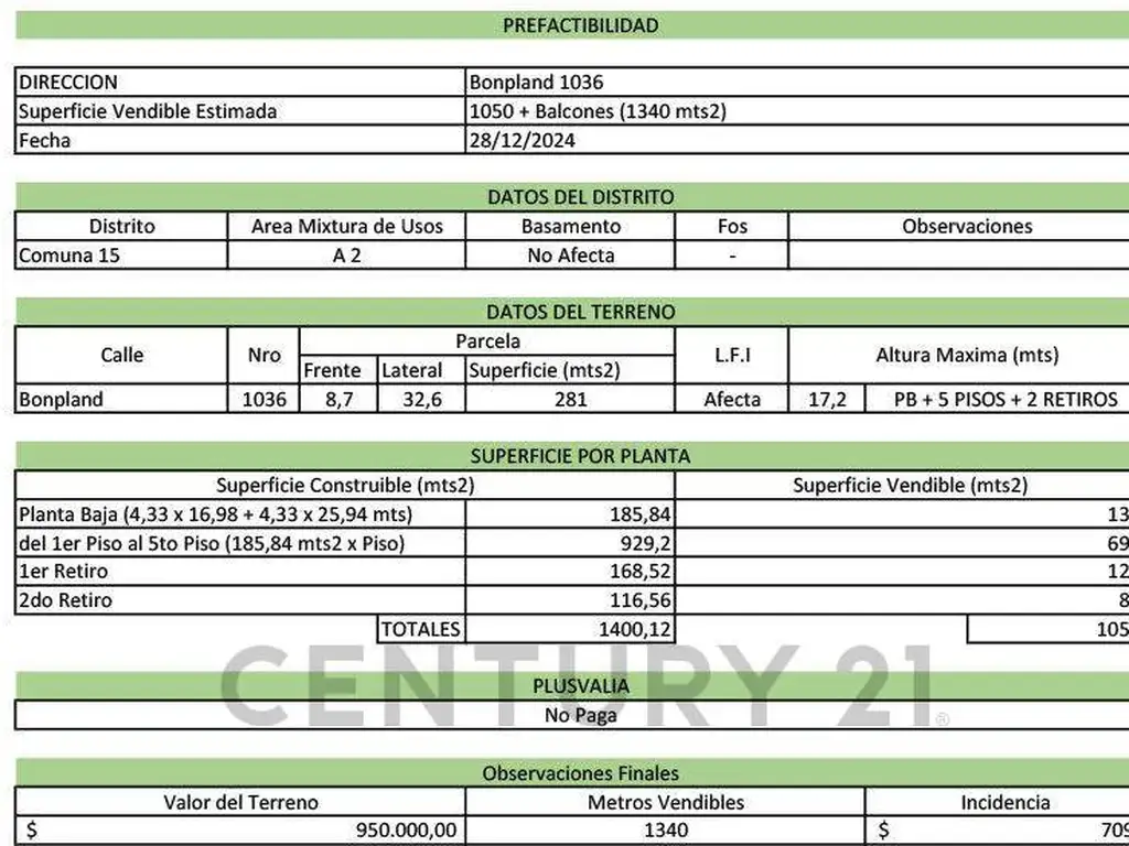 Potencial constructivo: Hasta 1,340 m² totales , con aproximadamente 1,050 m² vendibles más balcones.