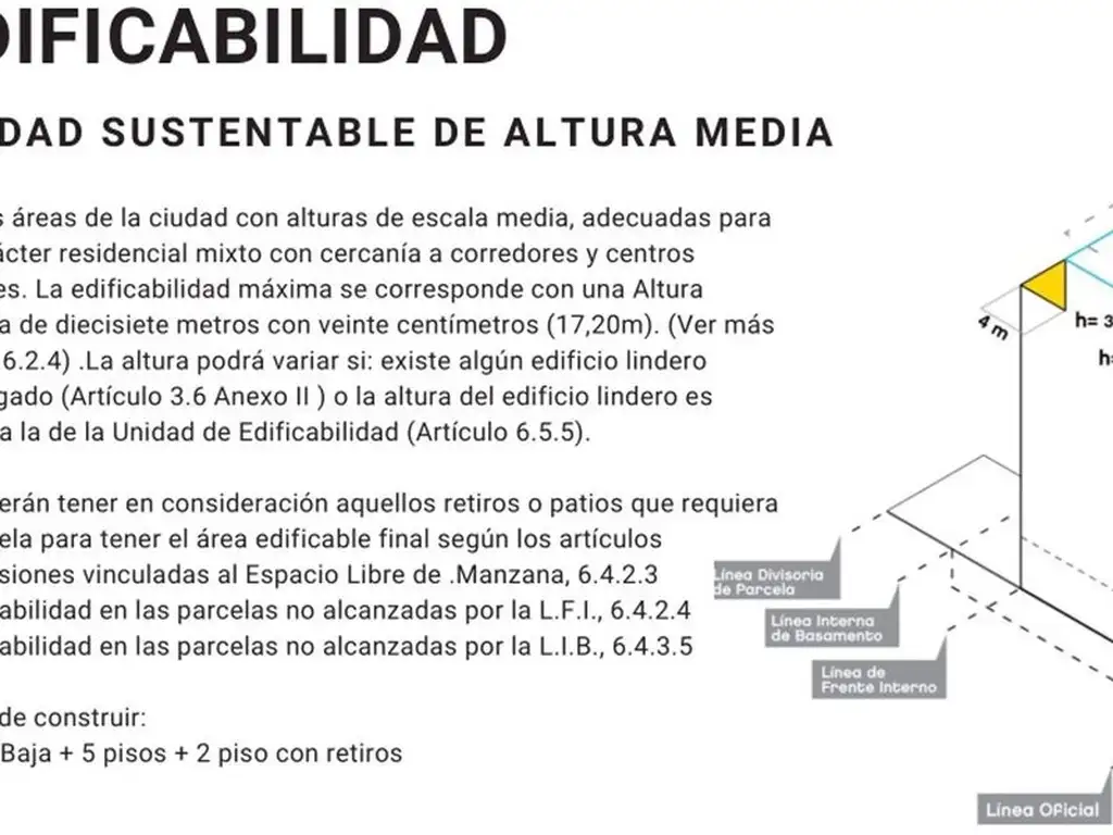 • Frente: Planta baja + 5 pisos + 2 pisos retirados (según normativa vigente)