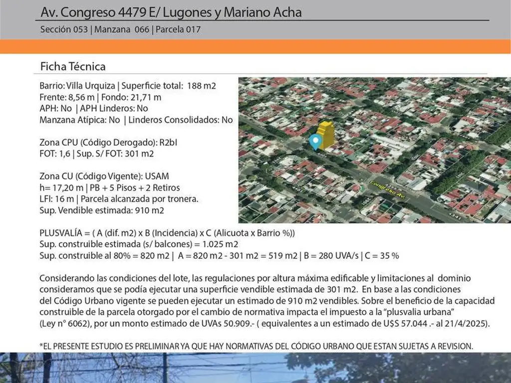 Considerando las condiciones del lote, las regulaciones por altura máxima edificable y limitaciones al dominio consideramos que se podía ejecutar una superficie vendible estimada de 301 m2. En base a las condiciones del Código Urbano vigente se pueden ejecutar un estimado de 910 m2 vendibles. Sobre el beneficio de la capacidad construible de la parcela otorgado por el cambio de normativa impacta el impuesto a la plusvalia urbana (Ley n 6062), por un monto estimado de UVAs 50.909.- ( equivalentes a un estimado de U$S 57.044 .- al 21/4/2025).