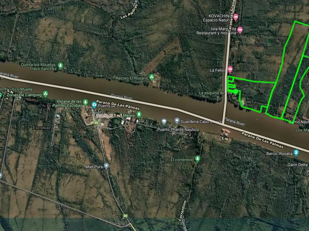 Ubicado frente al Club de los Pescadores de Escobar ( Ruta 25 y Rio Paraná), sobre Islas de San Fernando. Limita con los Ríos Carabelas, Paraná de las Palmas y el arroyo Carabelitas. Este campo ofrece una doble costa 200 metros de costa sobre el Río Carabelas y 600 metros sobre el Río Paraná de las Palmas.
